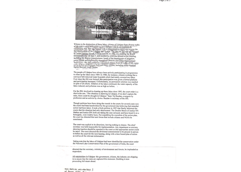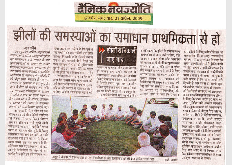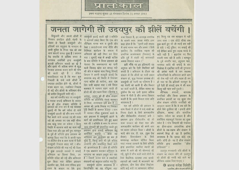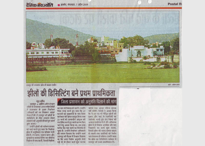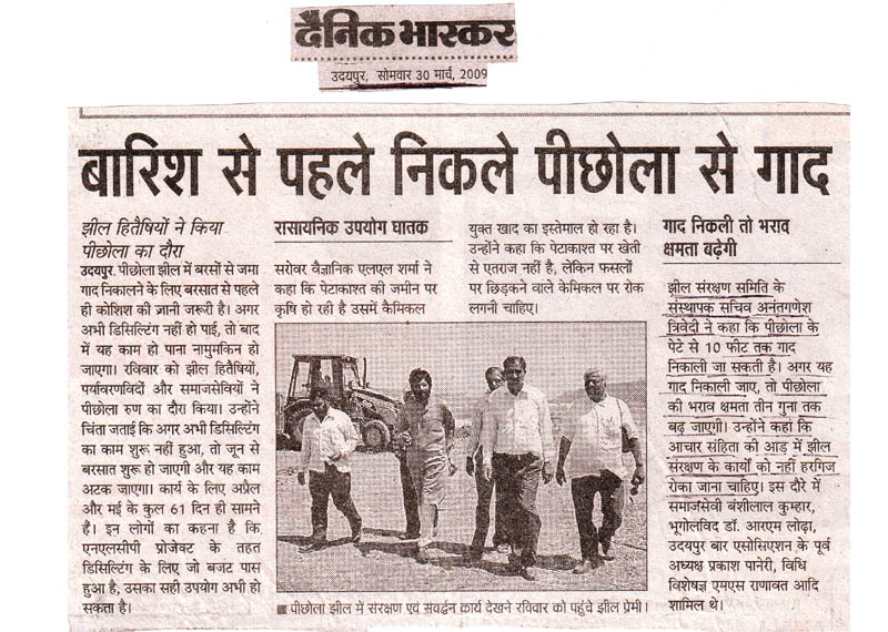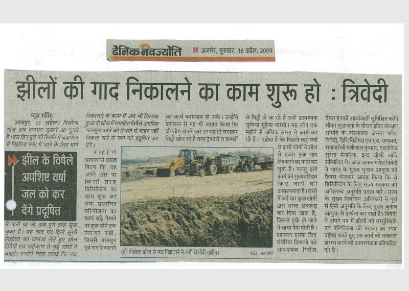The Samiti’s immediate move was to remove hyacinth and solid waste from the Lake Pichhola through mass participation. The Samiti also acted as a pressure group in the interest of lakes and took the matter to law courts by filing public interest litigation. It has put forth a number of proposals and prepared lake conservation reports including a proposal for constituting ' Lake Development Authority'. Owing to persistent efforts of the Samiti, the National Lake Conservation Plan (NLCP) sanctioned a project for the lakes – Pichola and Fatehsagar. The Samiti took initiative for scientific desilting of the lakes time after time.